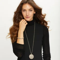 Two completely different motifs embellish the front and back of this dazzling statement necklace–a labyrinthine pattern graces its front, while vine-like tendrils intertwine with fine quality crystal on the reverse. Wear it long or short!