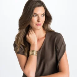 This goes-with-everything cuff bracelet includes a reversible leather band with blue and grey snake embossing on one side and an amethyst purple on the other. Wear it with either side showing, or alone — go sleek!