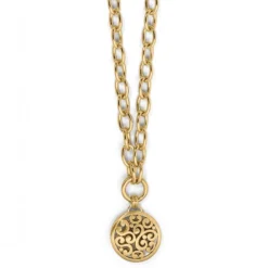 This circular pendant necklace with mesmerizing swirls and scrolls has the look of handmade silver artistry from Taxco, Mexico.