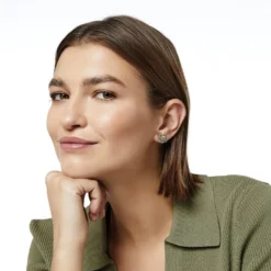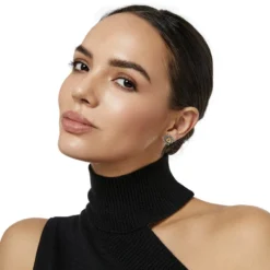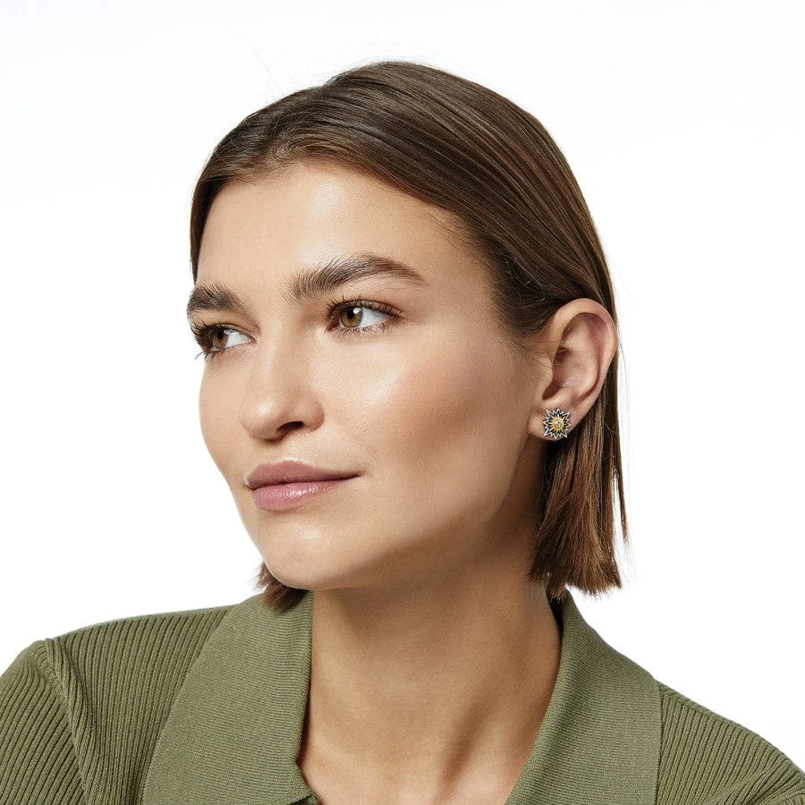 Simple star-shaped golden post makes quite a statement when outlined in black and centered with a fine European crystal that shimmers and gleams.