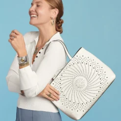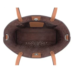 While still in keeping with the classic tone of Ferrara brand, this ultra-roomy tote bag is inspired by the ruggedness of California desert, cactus flowers in particular. The silver ball and golden barrel cactus are the main inspiration with their twisted segmented patterns and prickly textures. Backed with soft chocolate suede that peeks through the leather.