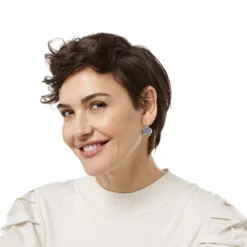 Inspired by the sun, these earrings with golden accents feature glass that are handcrafted in Germany and encased in clear gloss for luminosity.