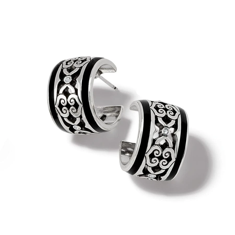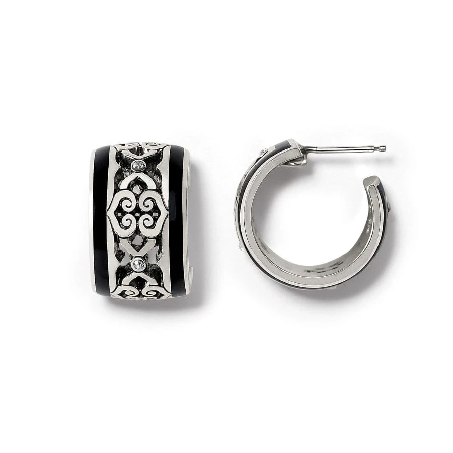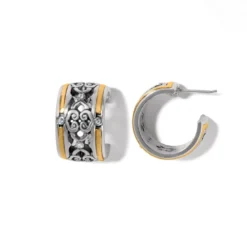 A decorative silver pierced design repeats in the center and is encased by a gold or black band on either side. These special hoops are a huggie style that’s easy to wear every day.