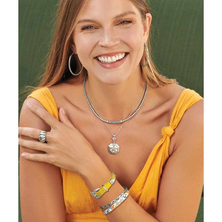 Inspired by tile designs of Deruta, Italy, this pendant necklace features blue, orange and lemon hues of hand-painted enamel for a zesty and fun-loving feel, plus hand-set crystal accents.