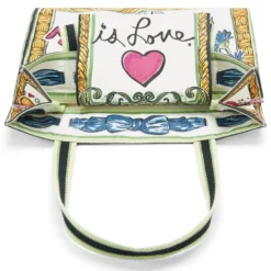 Our renowned designer Tom Clancy’s quick-sketch artwork adorns all the panels of this colorful and roomy canvas tote – even the inside pocket with its message of love.