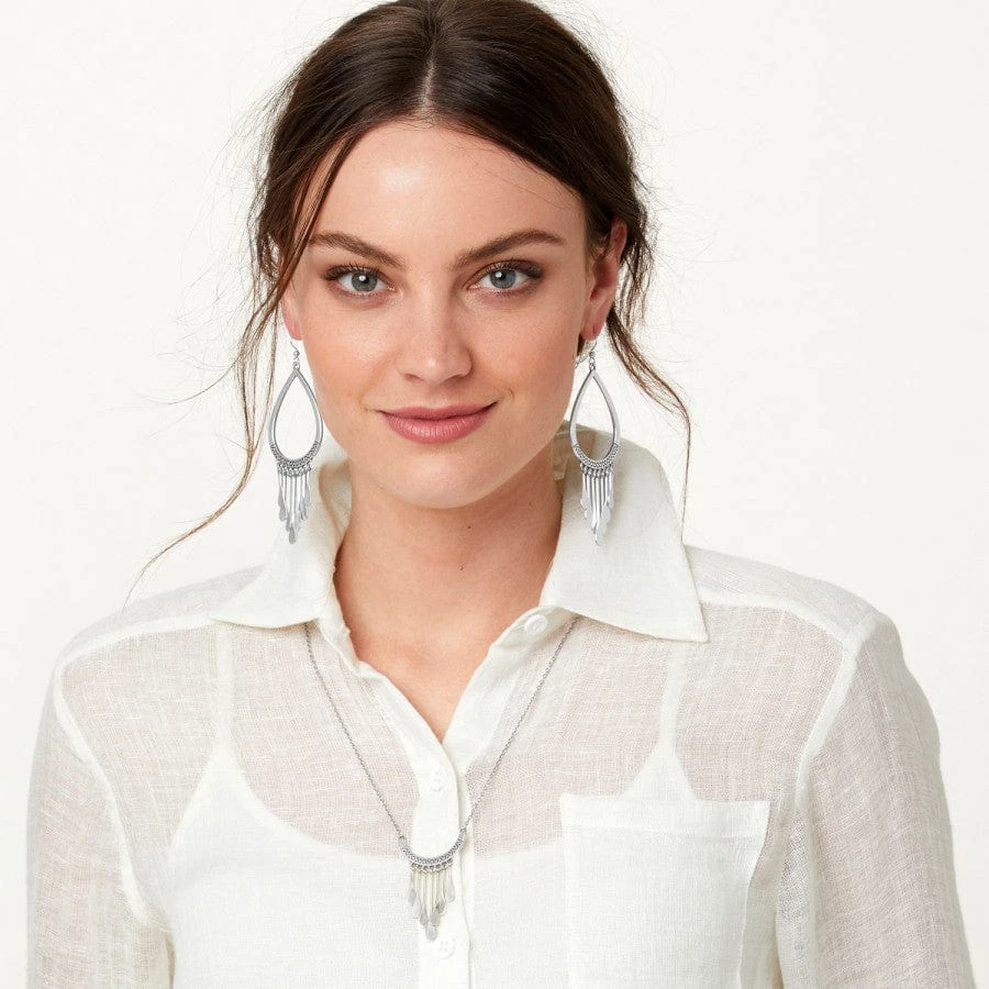 A swingy waterfall of drops is suspended from a u-shaped etched bar for an exotic, on-trend necklace. Marries a Moroccan-influenced design with a hint of Southwest chic.