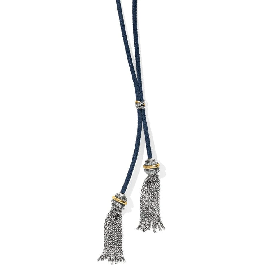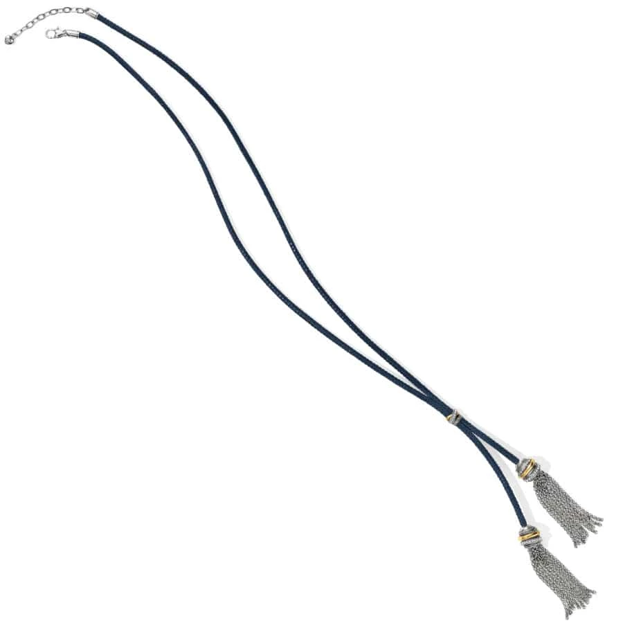 Hanging from a hip leather lariat-style necklace are two swishy tassels, giving extra flair to your look. A Neptune’s Ring bead finishes the look!