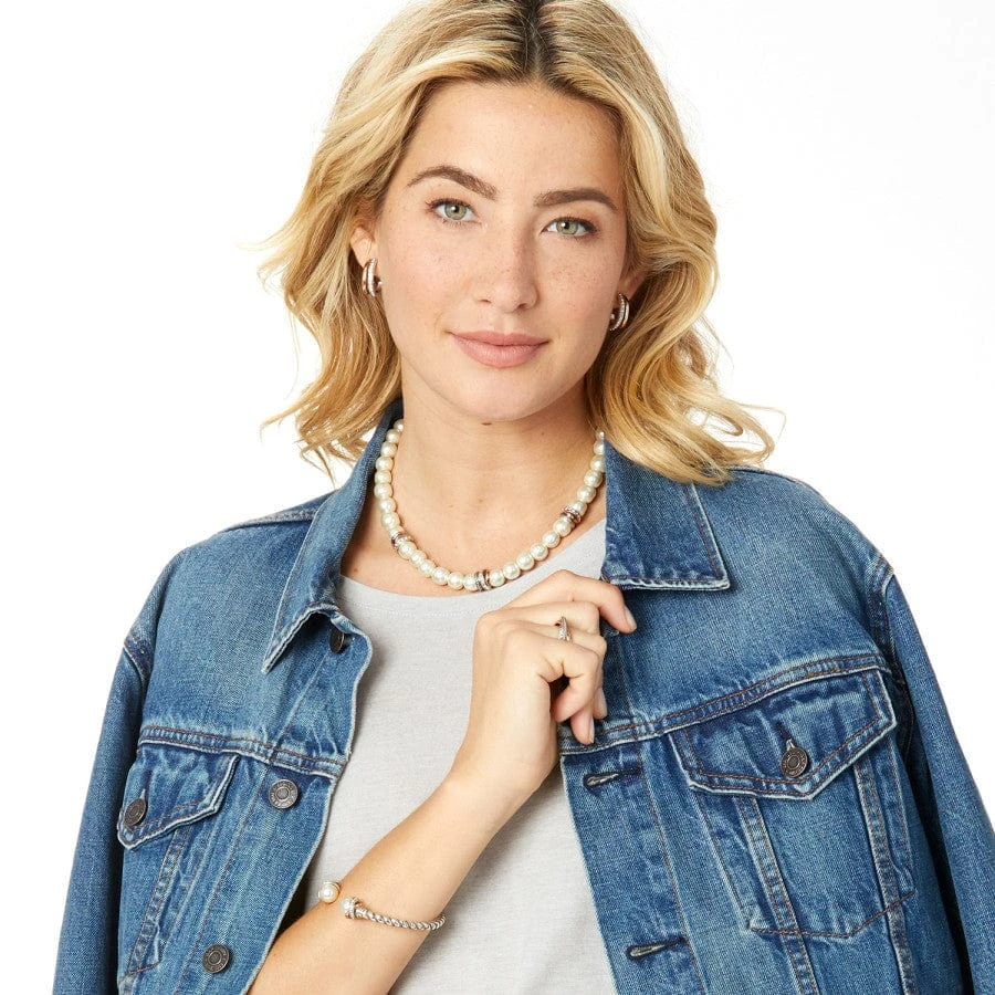 Decadent handmade Japanese pearls add luster and luxe to this short necklace embellished with a tumble of mixed metal and fine quality crystal-encrusted rings from our Neptune’s Rings Collection.