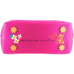 Our designer created a fantasy of orchids, angel’s trumpets, passion flowers, palm leaves and monstera leaves for this colorful and enchanting tote. On the bottom, a message reads, “palm trees and ocean breeze”