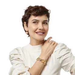 Inspired by the sun, this bracelet with golden links and hand-set glass that is handcrafted in Germany and encased in clear gloss for luminosity will add sunny warmth and color to your look.