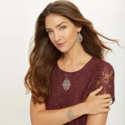 Intricate carvings in the courtyard of the Madrasa Youssef in Morocco were the muse or “tamal” for this collection’s elaborate motif. Its pave fine quality crystals, set in a complex, airy openwork design, mimics the refinement of fine jewelry.