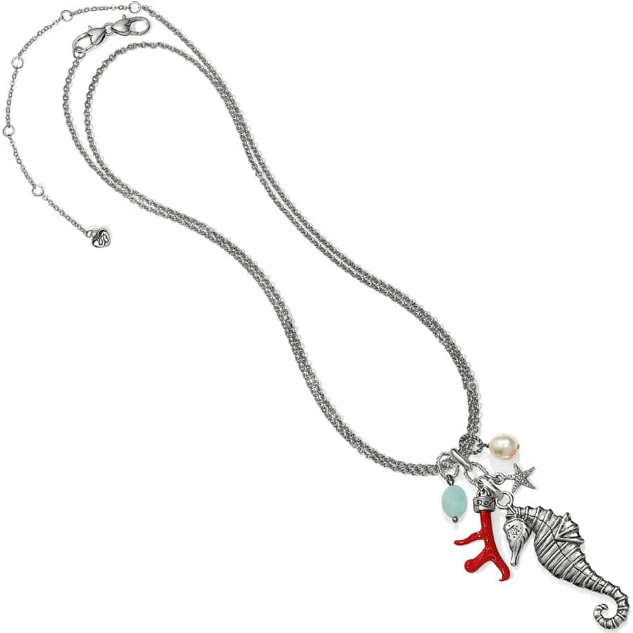 Looking as though it was plucked right from the deep blue sea, this charm pendant includes a seahorse, freshwater rice pearl, semi-precious amazonite bead and sculpted resin coral.